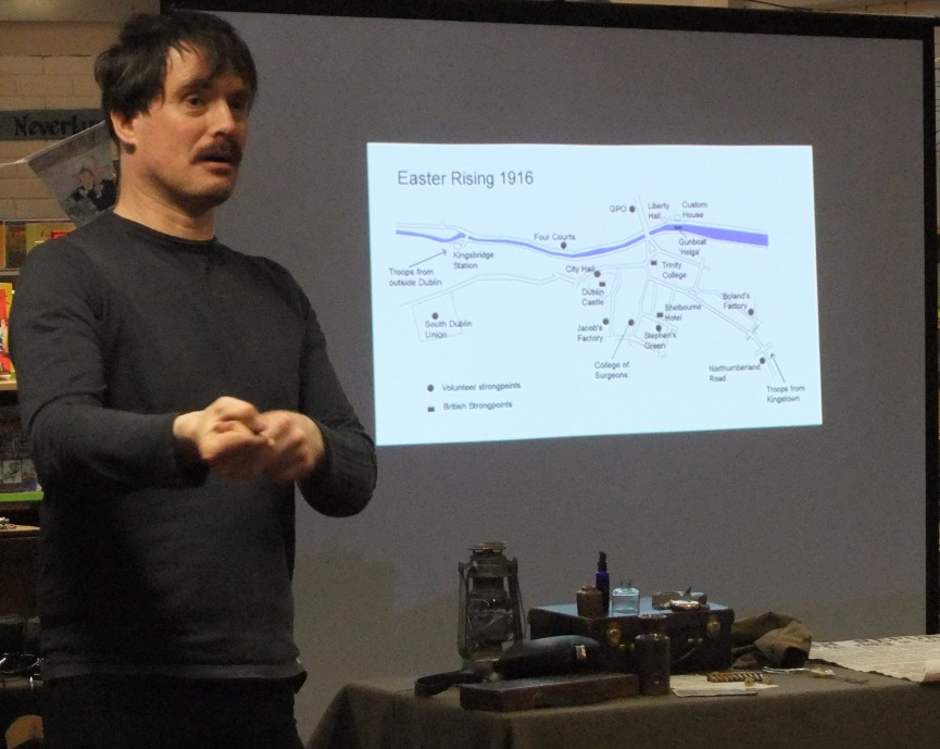 Living History specialist, Dave Swift, will give an illustrated talk about the people and events of 1916. But this is not your regular talk as Dave brings with him his large collection of original and replica artefacts including a Mauser rifle, hand guns, ammunition, volunteer uniforms, bandoliers, coins,volunteer membership cards and much, much more.