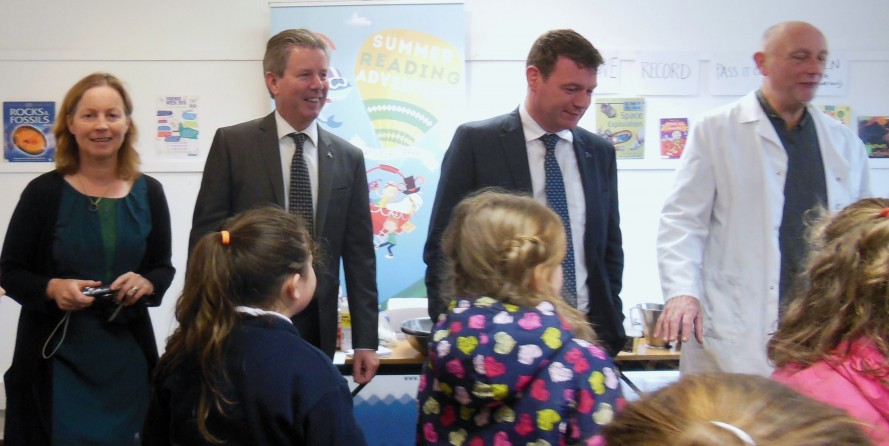 We were delighted to welcome Minister Alan Kelly and Senator Denis Landy to Carrick-on-Suir Library today (Monday 9th Nov) as we kicked off the Science Week celebrations. Third and fourth class girls from Presentation Primary School visited to learn loads of interesting science facts and conduct some homemade experiments. Minister Alan Kelly and Senator Denis Landy joined in the fun and helped ‘Professor’ Pat to demonstrate the ‘gravity’ experiment.