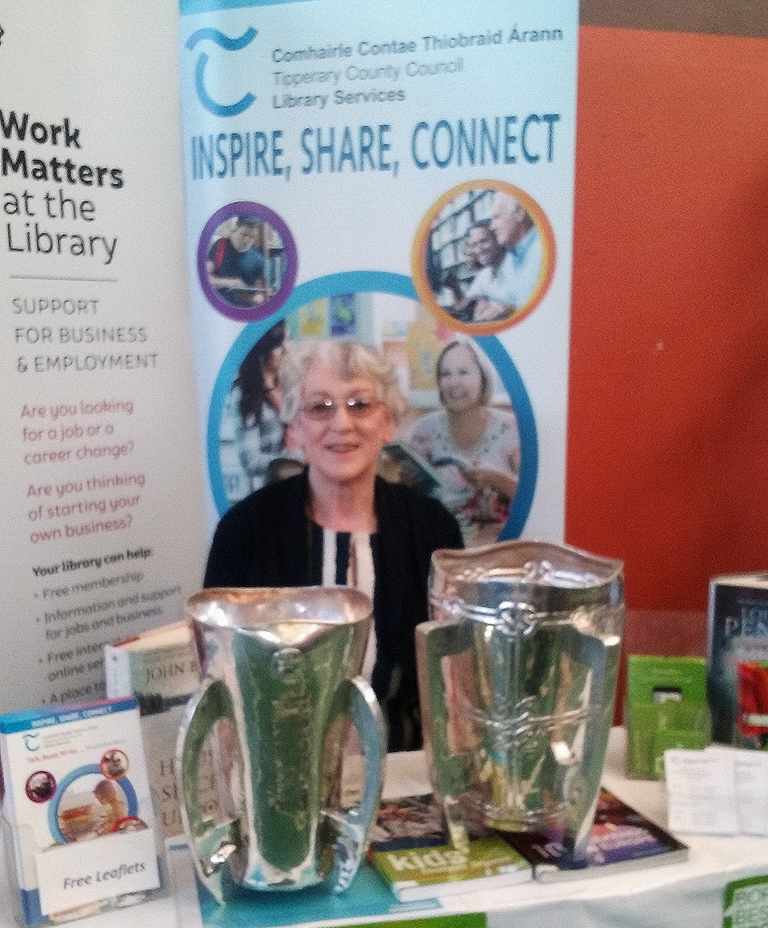 Nollaig Butler, Librarian in Tipperary Town Library, pictured here with the Liam McCarthy and the Irish Press Cup