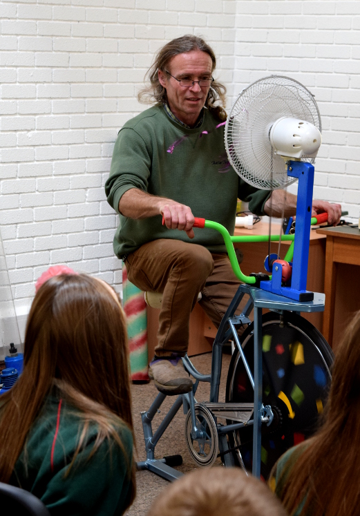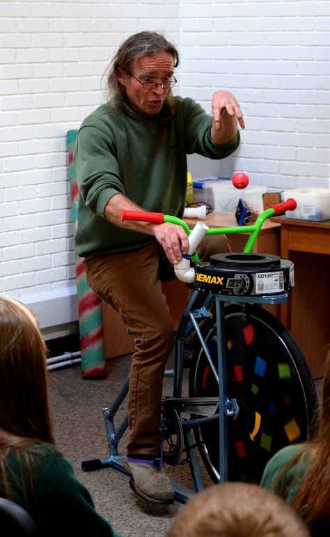 Using machines made from recycled things such as old bits of bicycles, washing machines, motors, pumps and fans, he created electricity to power a fan, lights, a water pump, a blender and even made smoothies for all the kids! many thanks to Paul for such an entertaining and educational workshop.