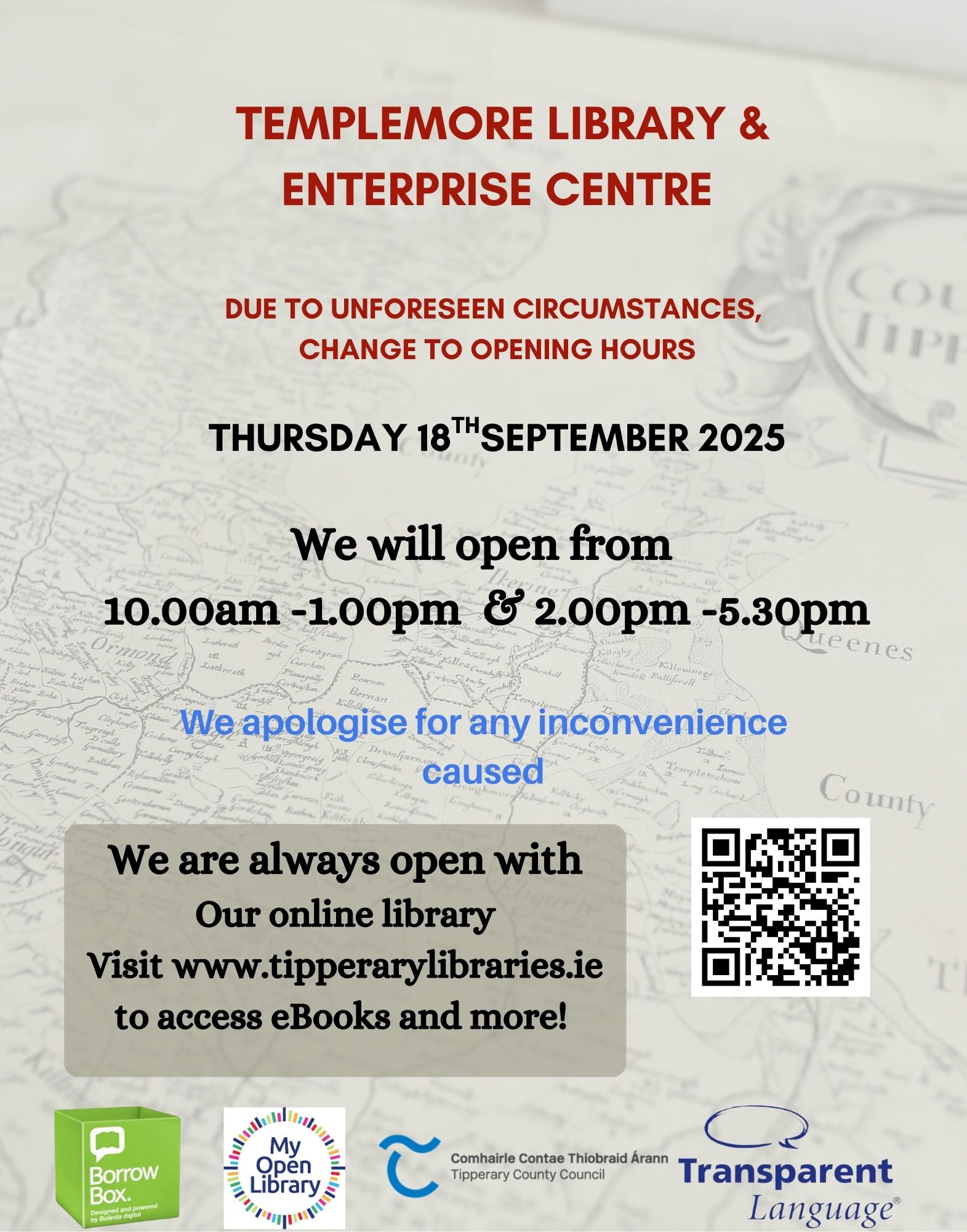 Due to circumstances beyond our control Templemore Library change to opening hours on Thursday 18th September 2025. The library will open from 10.00am – 1.00pm & 2.00pm -5.30pm. We apologise for any inconvenience caused.Read More