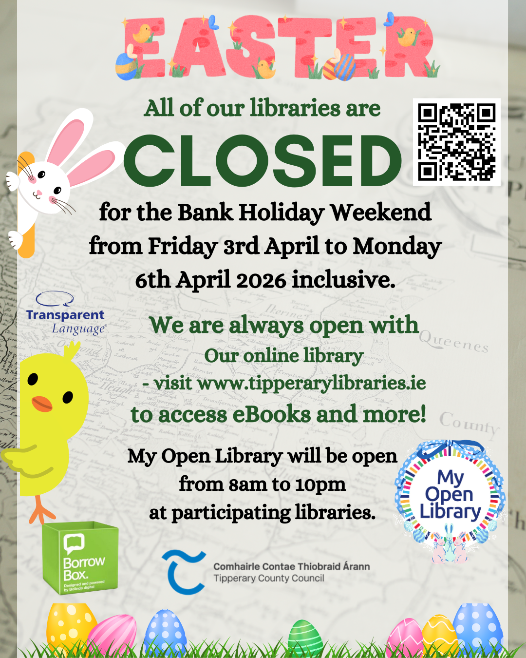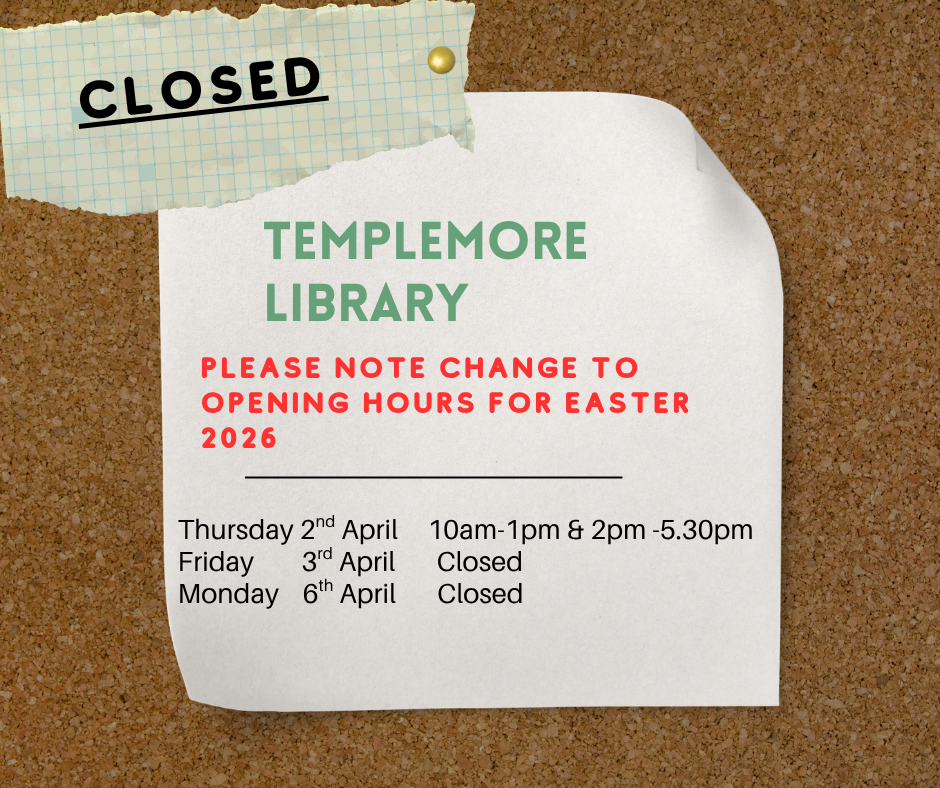 Please note change to Templemore Library opening hours Easter 2026 We will open 10am – 1.00pm & 2.00pm-5.30pm on Thursday 2nd April 2026 Closed Friday 3rd April 2026 Closed Monday 6th April 2026 Normal hours resume on Tuesday 7th April 2026Read More