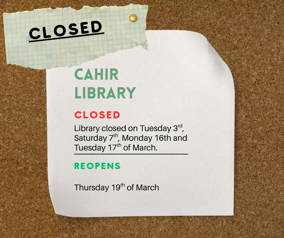 Cahir Library will be closed on the following dates: Tuesday 3rd March, Saturday 7th March, Monday 16th and Tuesday 17th March (St. Patrick’s Day). You can still renew loans or make reservations via your online account and you can return books to any other branch in the county.