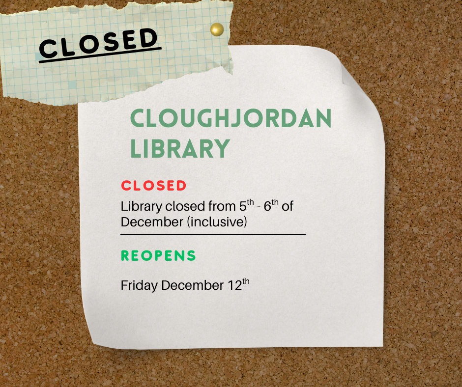 Due to circumstances beyond our control Cloughjordan Library will be closed from Friday the 5th to Saturday the 6th of December (inclusive). The library will reopen on Friday the 12th of December. You can still renew or reserve books using your online account and books can be returned to any other branch in the county. We apologise for any inconvenience caused.