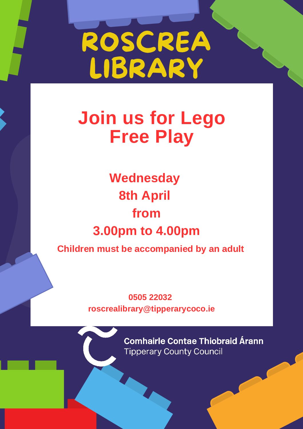 Free play Lego in Roscrea Library on Wednesday 8th April from 3.00pm to 4.00pm.