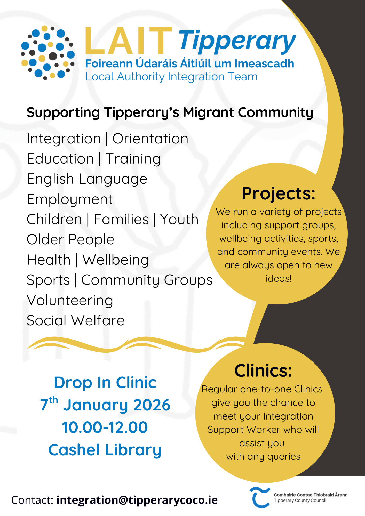 Join us for an information session hosted by the Local Authority Integration Team on Wednesday, January 7th, 🕥 10:00 AM – 12:00 PM in Cashel library.
