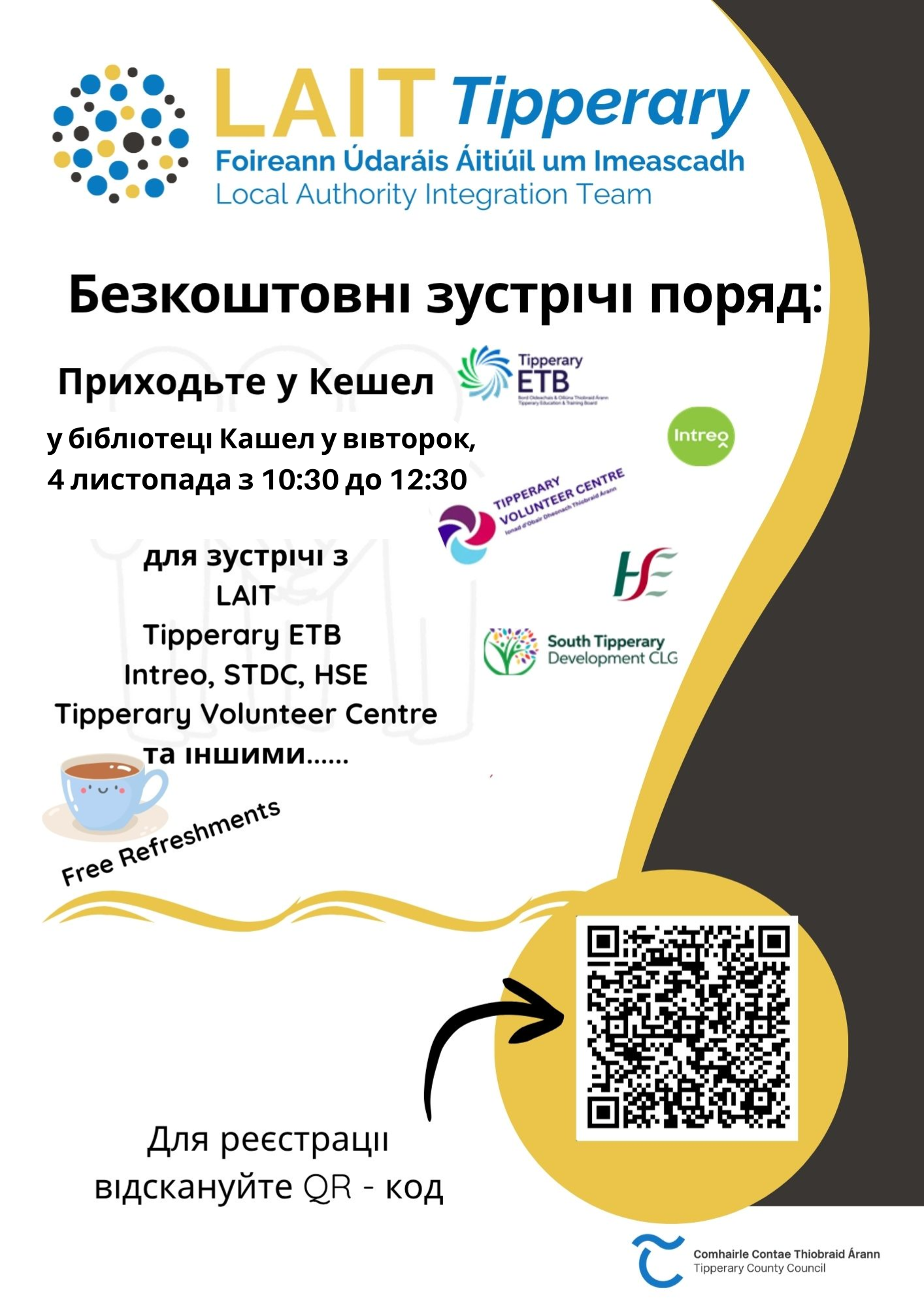Запрошуємо на інформаційну зустріч, організовану Командою Інтеграції Місцевої Влади у вівторок, 4 листопада, з 10:30 до 12:30 у бібліотеці Кашела.