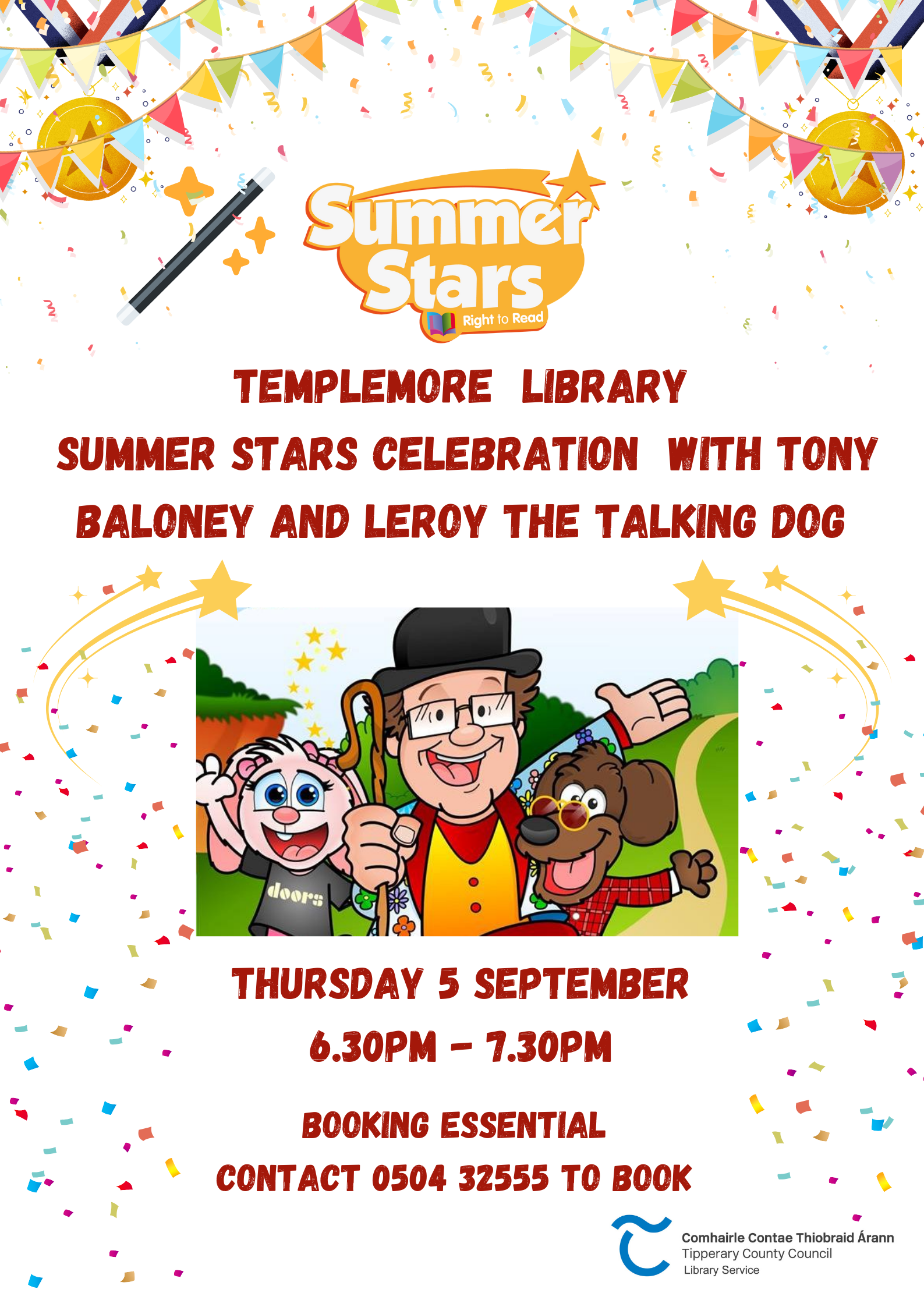 Join us in Templemore Library for our Summer Stars Celebration with Tony Baloney and Leroy the Talking Dog.