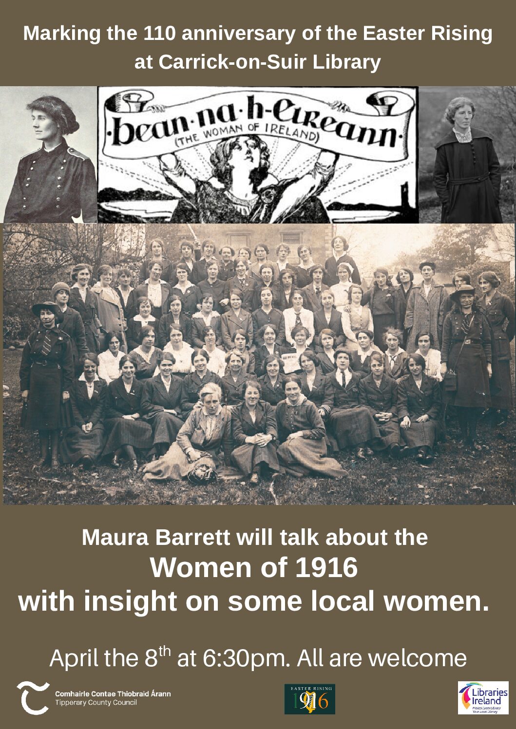 To mark the 110 anniversary of the 1916 rising, Maura Barrett will give a talk focused on the women that stood tall, and were crucial to the rebellion, with specific insight on our local female patriots.