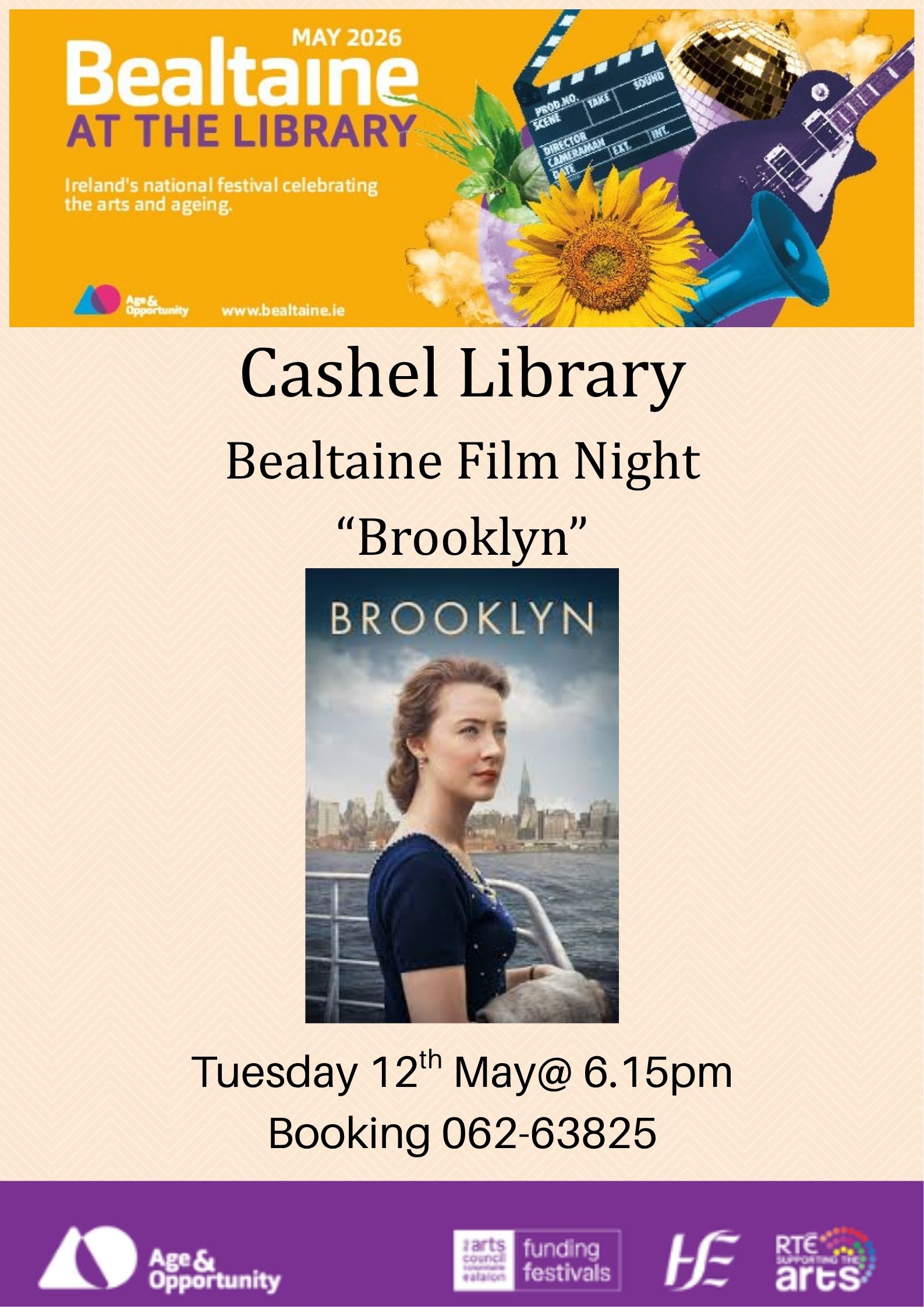 Bealtaine Film " Brooklyn" takes place on Tuesday 12th May 6.15pm Booking Essential 062-63825 Based on the book by Colm Toibin : An Irish immigrant lands in 1950s Brooklyn, where […]