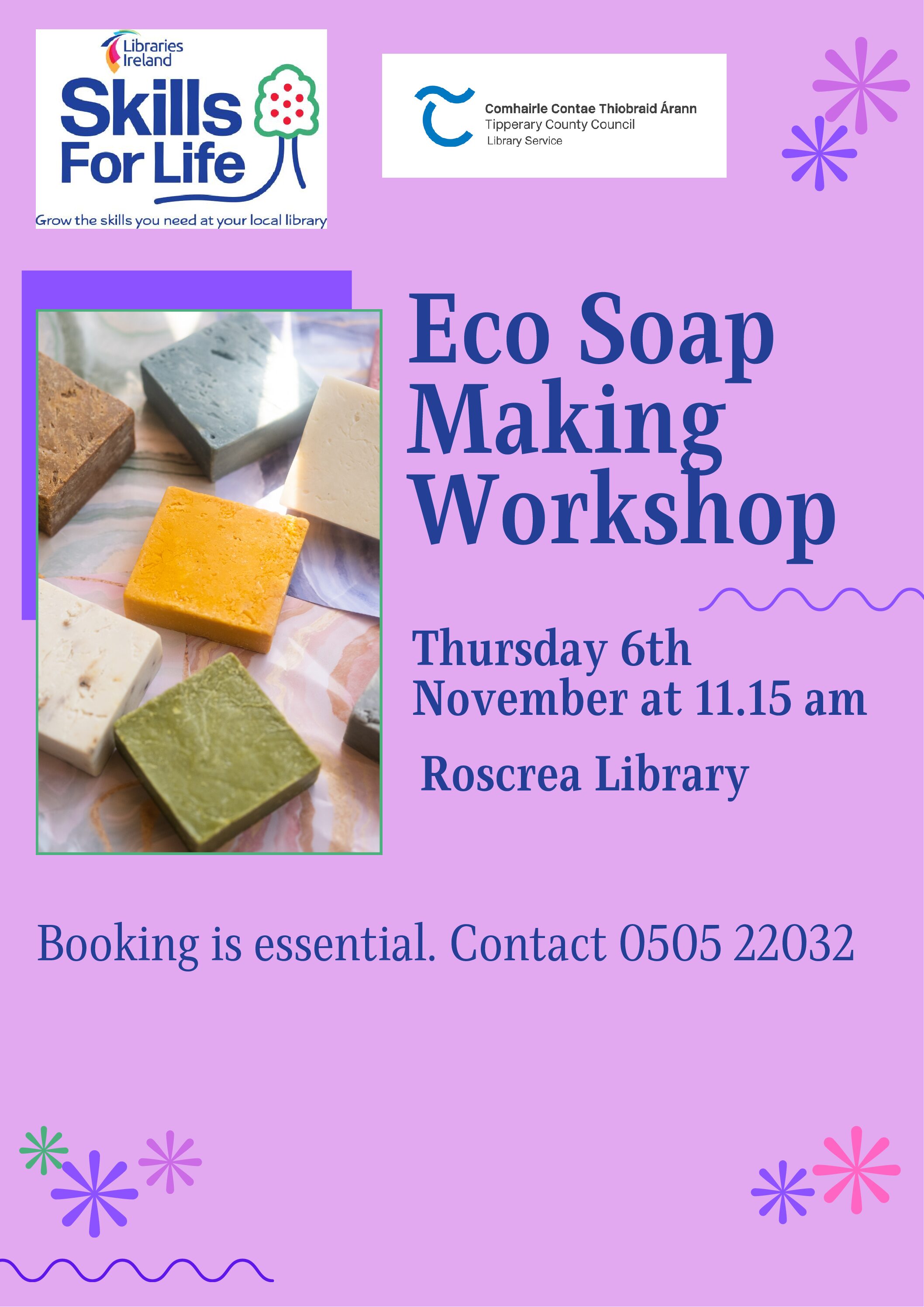 πŸ“’ Eco Soap Making Workshop 🧼 Roscrea Library πŸ“… Wednesday, 6th November πŸ•š 11.15am Join us for a hands-on workshop where you'll learn how to make your own eco-friendly soap! 🌿 🎟️ Booking essential – Call 0505 22032 to reserve your place.
