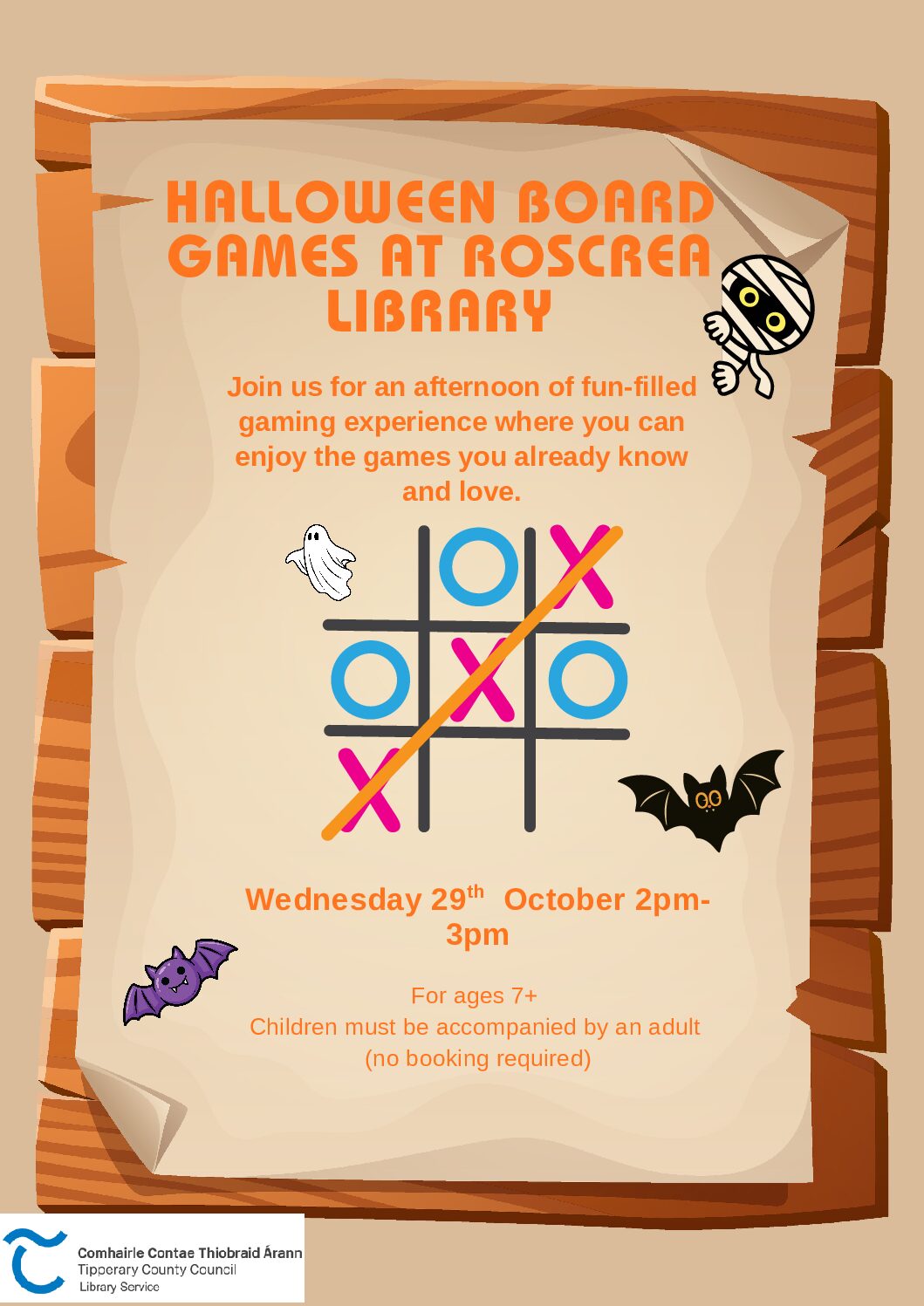 πŸŽƒ Halloween Board Games Afternoon πŸ“ Roscrea Library πŸ“… Wednesday, 29th October πŸ•‘ 2pm – 3pm Come along for some classic and fun board games! Perfect for children aged 7 and up. πŸ‘¨β€πŸ‘©β€πŸ‘§ Children must be accompanied by an adult. 🚫 No booking necessary – just drop in and play!