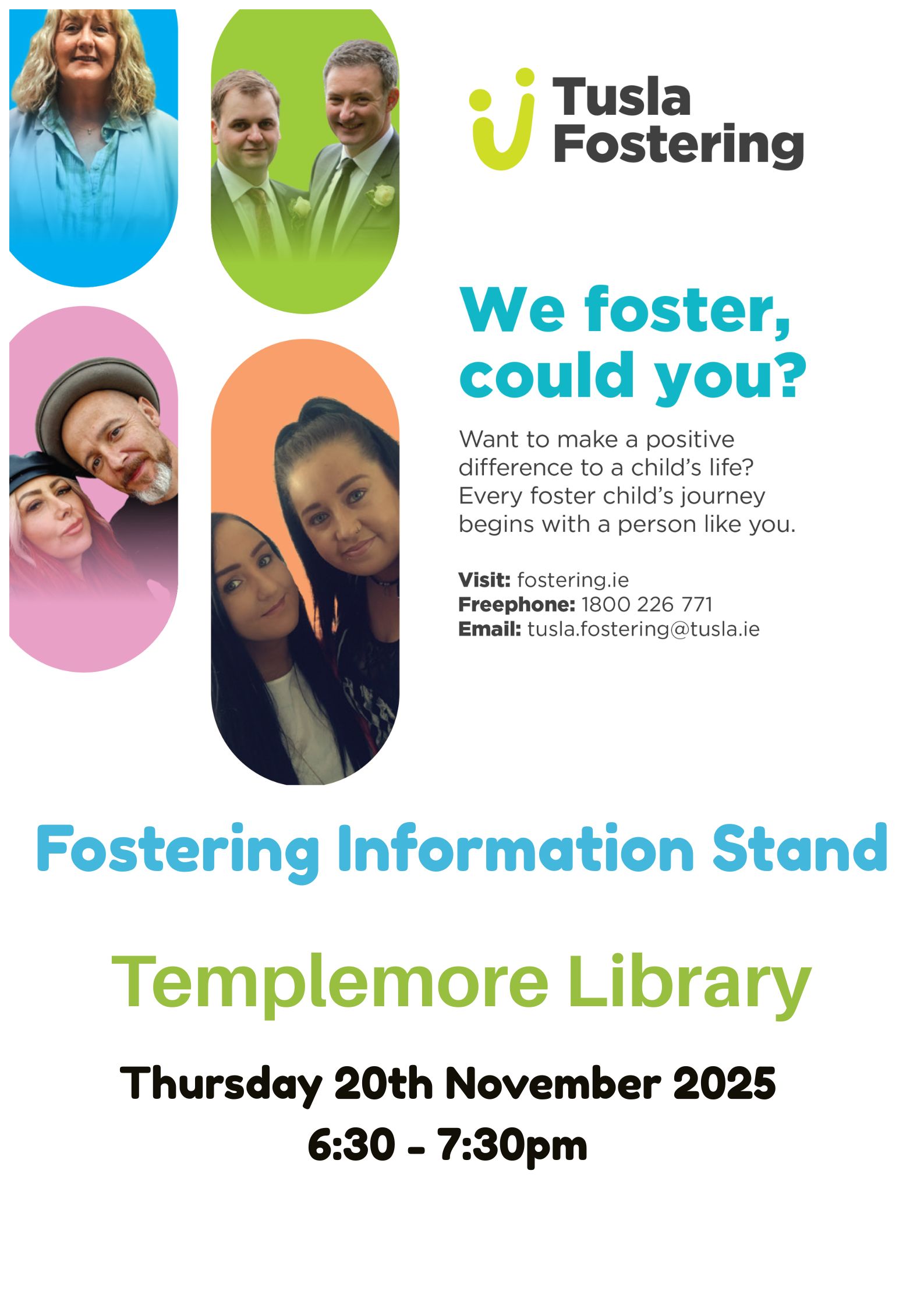 Tusla Fostering Information Stand at Templemore Library. Thursday 20th November 6.30pm - 7.30pm. Contact 052 616 6190 for more information.