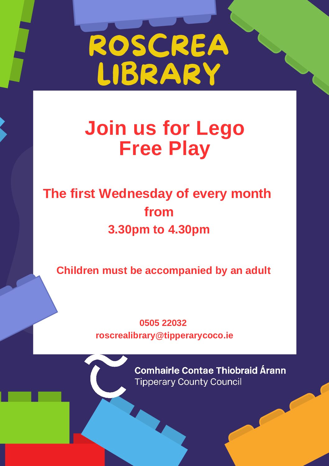 Free Play Lego in Roscrea Library on the first Wednesday of every month. From 3.30pm to 4.30pm. No booking necessary. Children must be accompanied by an adult.