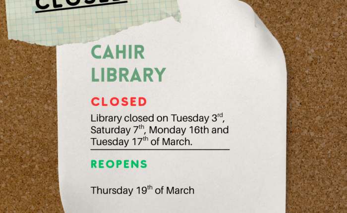 Cahir Library will be closed on the following dates: Tuesday 3rd March, Saturday 7th March,...