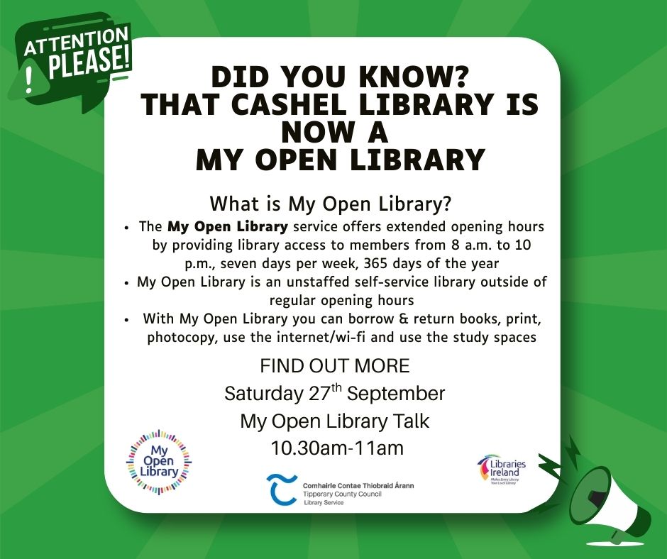Did you know that Cashel Library is now a My Open Library? Cashel library will host a talk on the MOL services available This talk will take place at 10.30am -11am #LibrariesIreland #TakeACloserLook