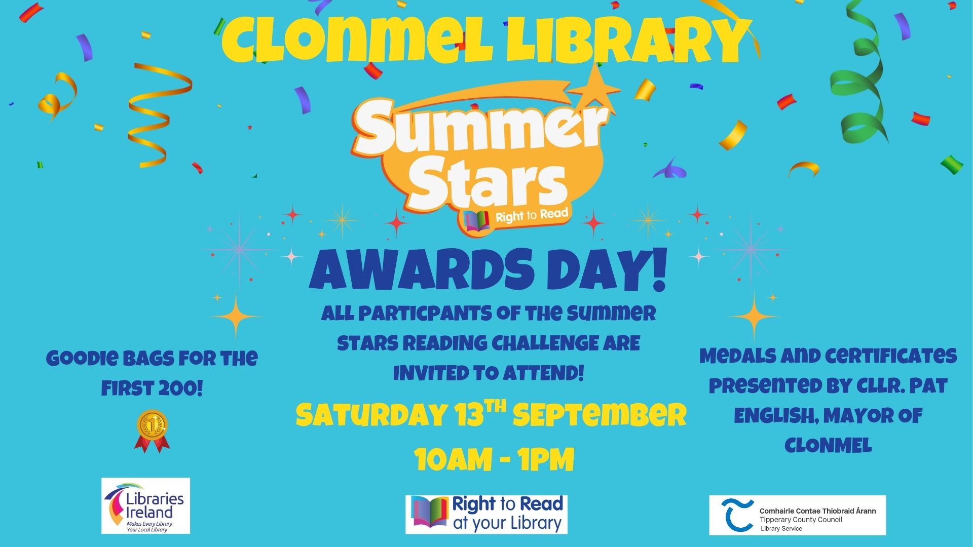Attention all Summer Stars participants! We are holding our annual Summer Stars Awards Day at Clonmel Library on Saturday 13th of September from 10AM - 1PM. All participants of the Summer Stars reading challenge are invited to attend and collect their certificate. All medals and certificates will be presented by Cllr. Pat English, Mayor of Clonmel. […]