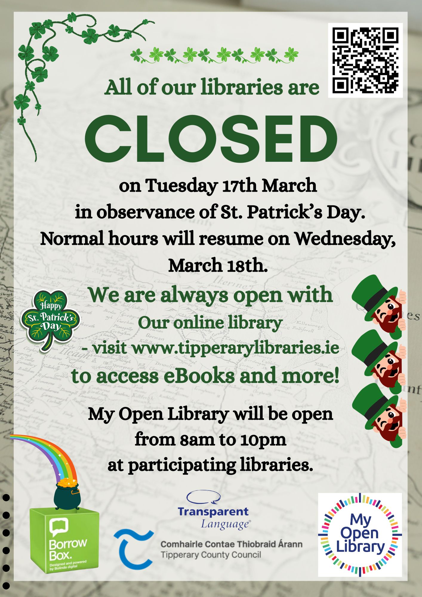 In celebration of St. Patrick’s Day, all library branches will be closed on Tuesday, March 17th (17/3/2026). Normal operations and scheduled hours will resume across all locations on Wednesday, March 18th (18/3/2026).