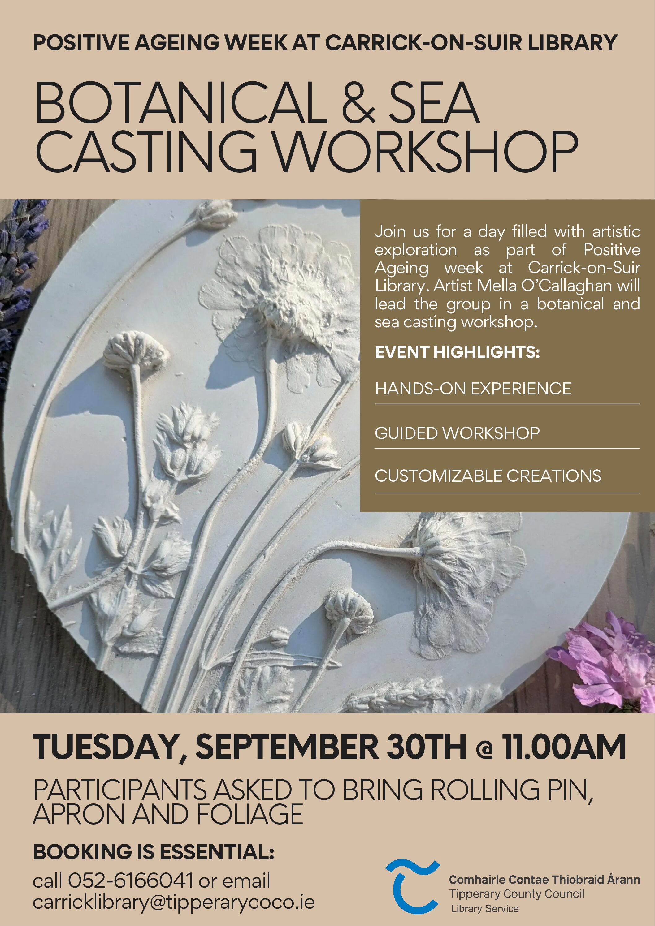 Join us on Tuesday, September 30th at 11am for a day filled with artistic exploration as part of Positive Ageing week at Carrick-on-Suir Library. Artist Mella O’Callaghan will lead the group in a botanical and sea casting workshop. Participants are asked to bring a rolling pin, an apron and some foliage. Booking is essential: Call...Read More