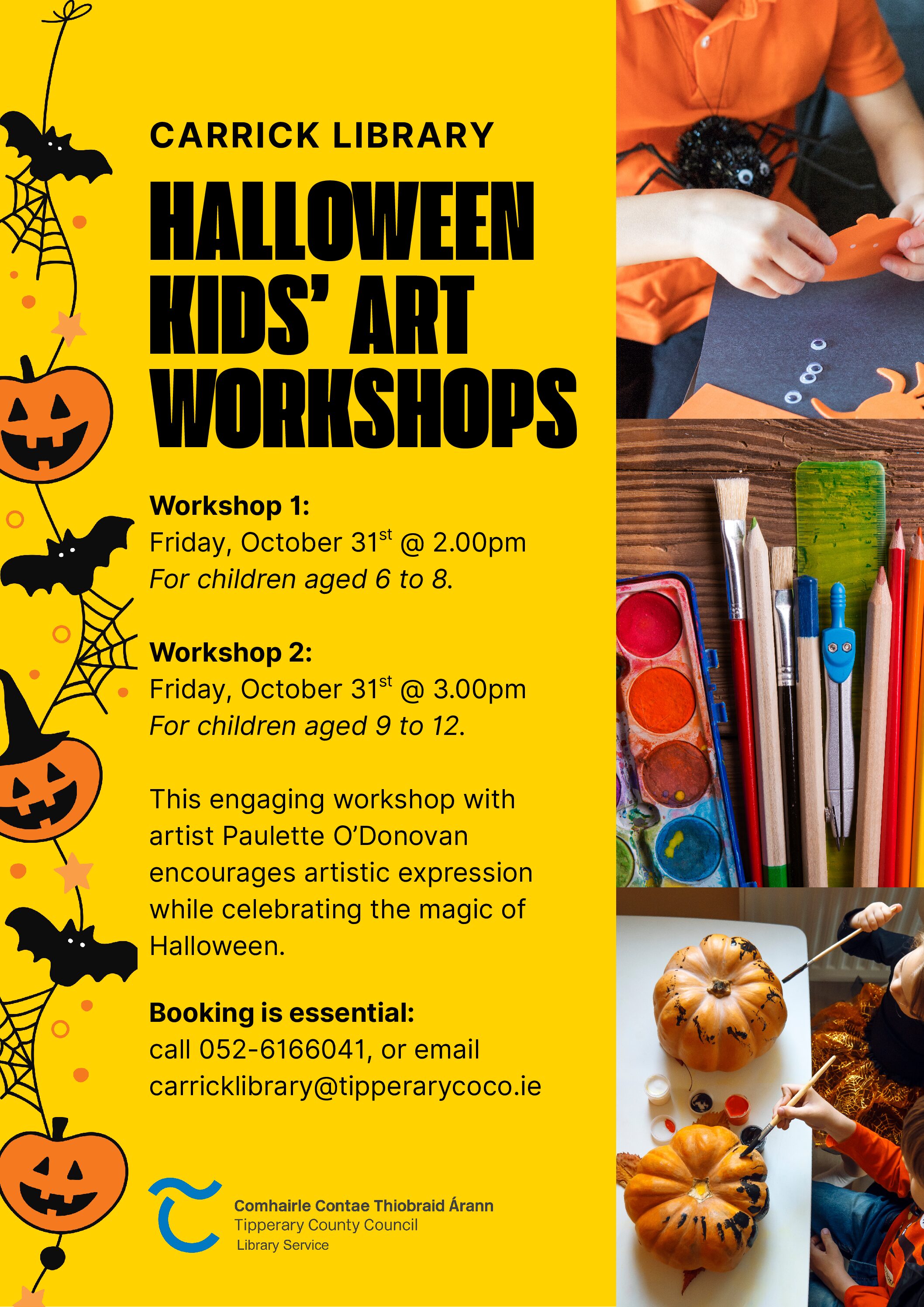 Halloween Kids’ Art Workshops @ Carrick Library Workshop 1: Friday, October 31st @ 2.00pm For children aged 6 to 8. Workshop 2: Friday, October 31st @ 3.00pm For children aged 9 to 12. This engaging workshop with artist Paulette O’Donovan encourages artistic expression while celebrating the magic of Halloween. Booking is essential: call 052-6166041, or...Read More