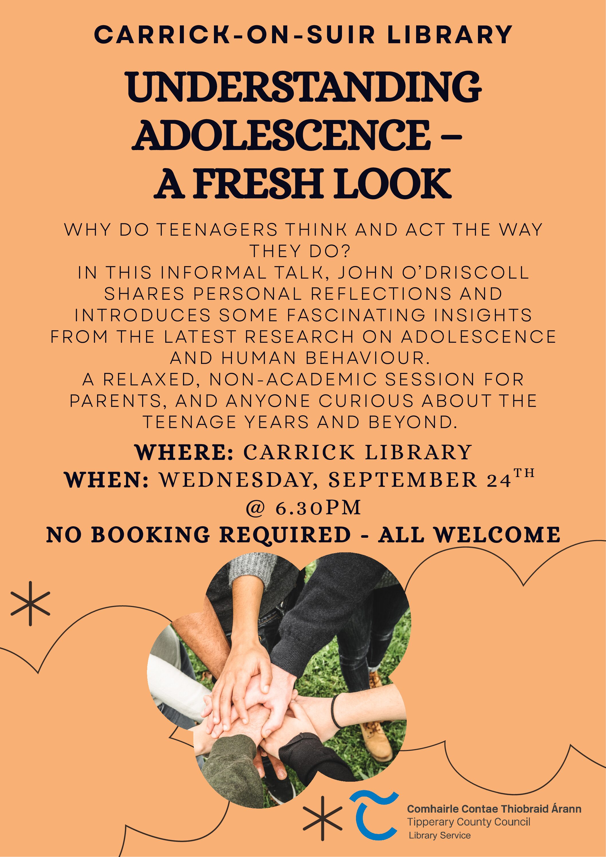 Why do teenagers think and act the way they do? In this informal talk, John O’Driscoll shares personal reflections and introduces some fascinating insights from the latest research on adolescence and human behaviour. A relaxed, non-academic session for parents, and anyone curious about the teenage years and beyond. Where: Carrick Library When: Wednesday, September 24th...