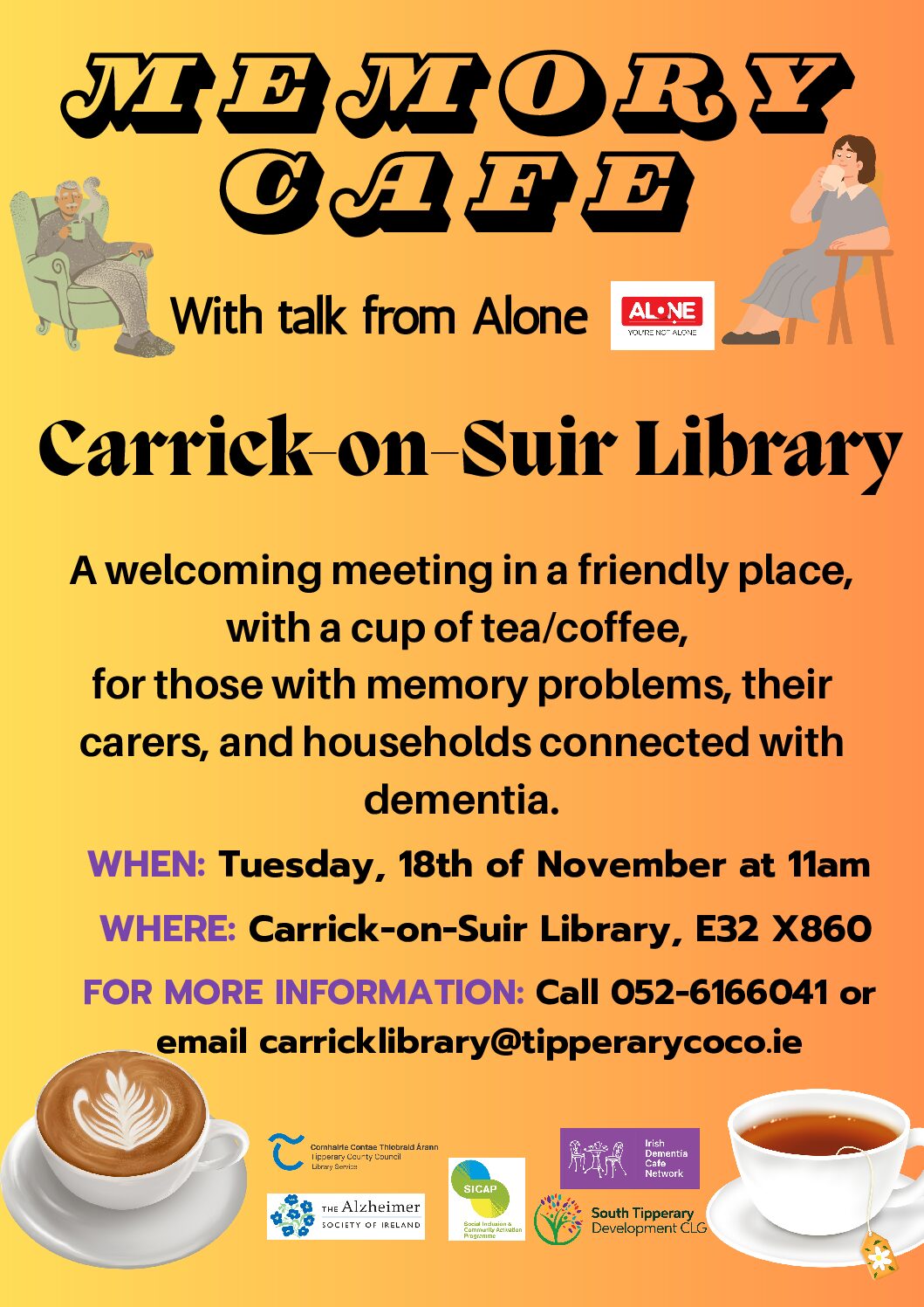 A welcoming meeting, in a friendly place with a cup of tea/coffee, for those with memory problems, their carers, and households connected with dementia. This month sees a visit from Alone staff, for what I've been told is a very entertaining talk. Tuesday, 18th of November at 11am, Carrick-on-Suir Library, E32 X860 For More Information […]