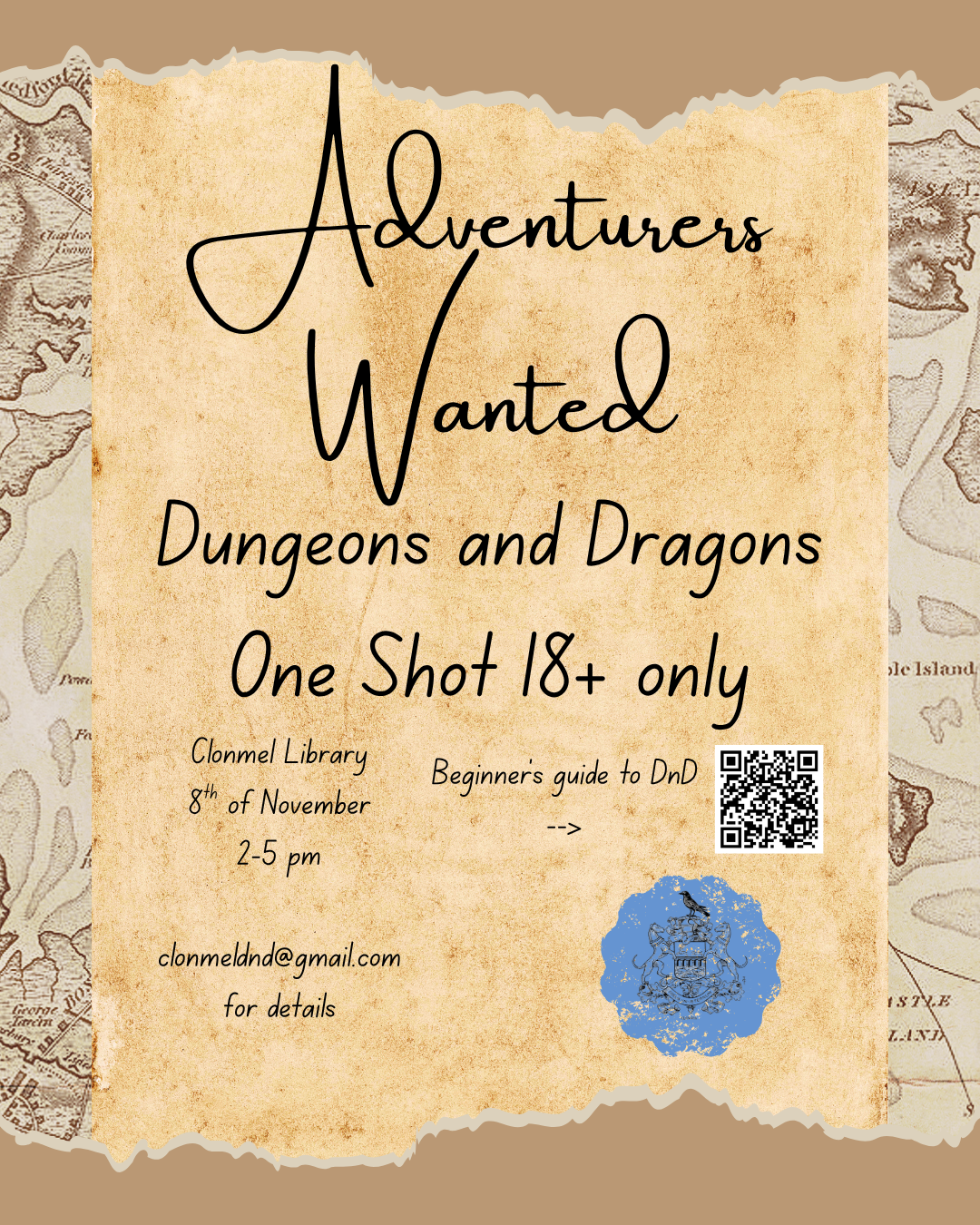 🧙‍♂️✨ Join us at Clonmel Library for a Beginner-Friendly D&D Adventure! Whether you've never rolled a die or just want to learn the ropes, this event is perfect for newcomers and veterans alike. Age restrictions: this event is for 18+ Spaces are limited. For more information contact clonmeldnd@gmail.com.